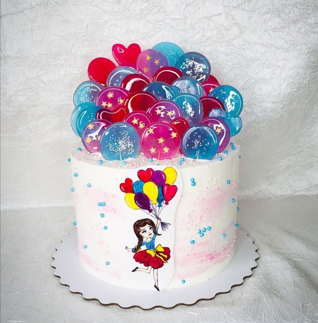 Карамельная имитация воздушных шаров только подчеркнет легкость дизайна данного тортика